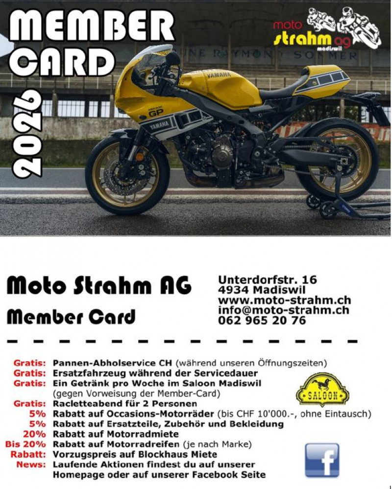 Mit der Strahm Membercard für CHF 100.- gibt`s 5% Rabatt (bis CHF 10´000.-) auf Occasionsfahrzeuge (ohne Eintausch), 5% Rabatt auf Ersatzteile, Bekleidung, Zubehör, bis 20% Rabatt auf Mietmotorräder und Pneus. Gratis Raclette-Essen für 2 Personen ende Saison. Jede Woche ein Gratisgetränk im Saloon Madiswil. Kostenloser Pannendienst in der ganzen Schweiz während unserer Öffnungszeiten, kostenfreies Ersatzfahrzeug während der Servicedauer.